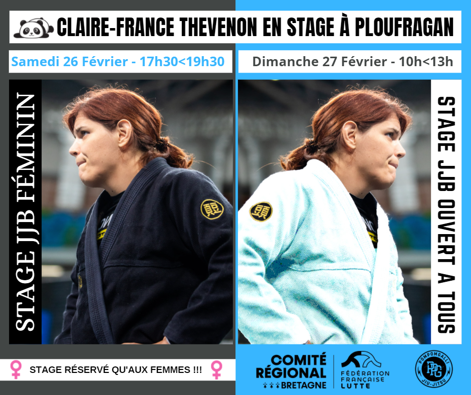 Nous vous annonçons la venue de Claire-France Thévenon en stage de jiu-jitsu brésilien le samedi et dimanche 26-27 février prochains. Celle-ci est double championne du monde en Grappling Gi et no Gi.